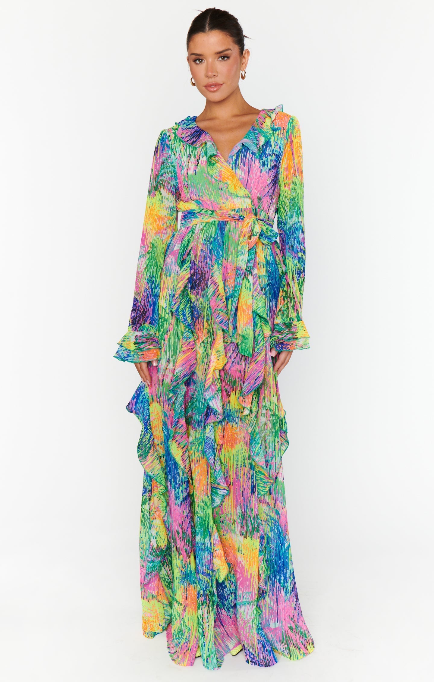 Girl, let's see you twirl! The Jenny Ruffle Maxi is the ultimate spring choice, with a ruffled neckline, exaggerated sleeves, and a vibrant colorful chiffon. Pair it with heels and hoops for a stellar look.
