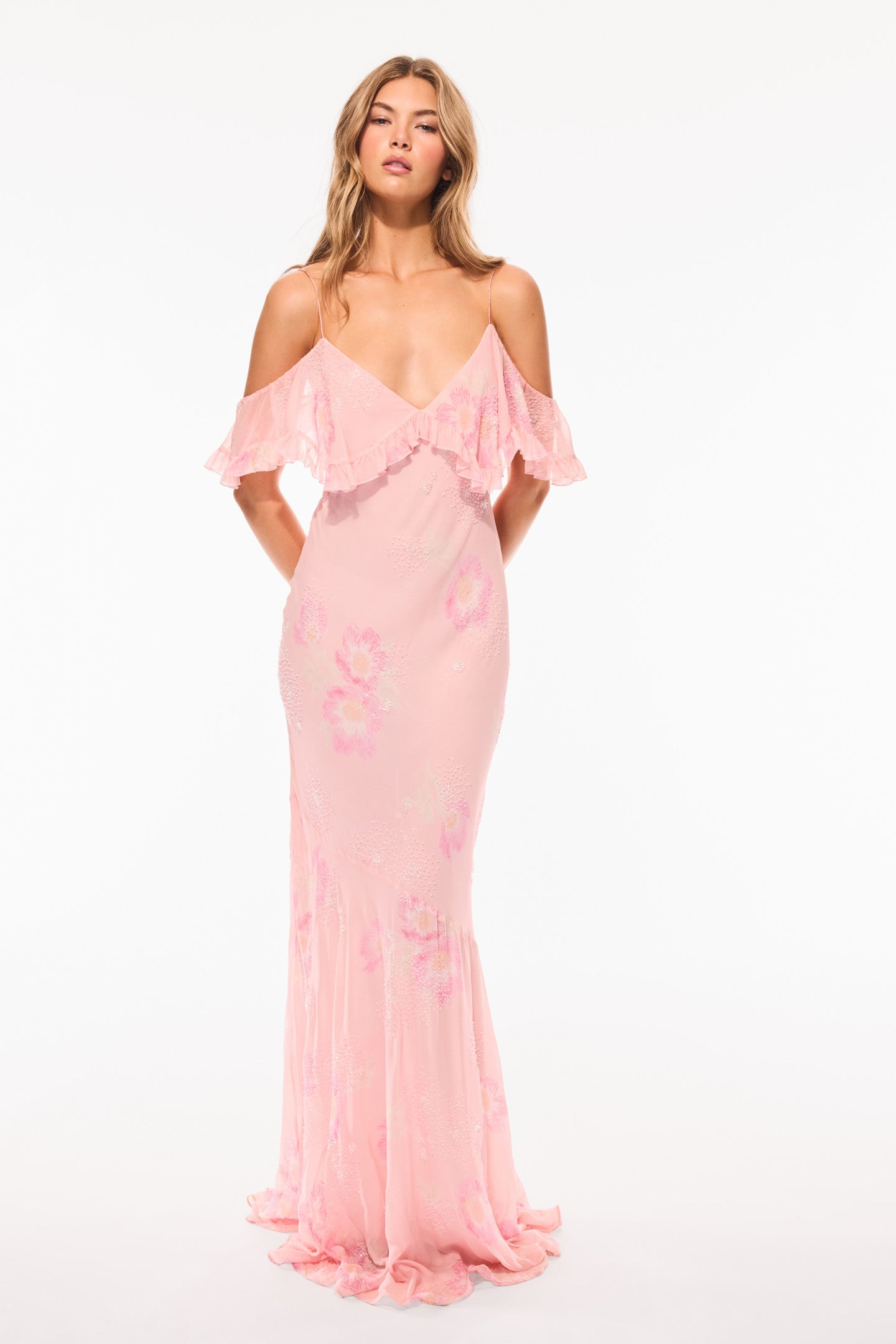 Effortlessly chic in the Librae Dress. This feminine event dress features a printed viscose chiffon fabric with large scale romantic florals highlighted with sequins giving this piece a subtle shimmer. The maxi gown has a flattering, mermaid shape with a body-skimming silhouette. With a bodice cut, the piece features a sweeping skirt, a cape cascading around the bodice and shoulders, spaghetti straps, and includes a zipper.