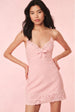 Channeling the Upper East Side energy in the Meva Dress. This preppy mini debuts with a polished, tweed fabric featuring custom ditsy floral guipure lace at the neckline and hem of the dress. The A-line mod dress begins with spaghetti straps before falling to an empire waisted above a fitted bodice. This piece is finished with a top-applied charmeuse bow at center front and a side seam zipper for functionality.