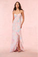 On the way in the Miu Dress. This gorgeous gown stuns with a viscose chiffon fabric featuring mixed prints all over. The dress begins with velvet spaghetti straps above a sweetheart neckline with ruching at the bodice which then descend to a cascading skirt that flows slightly longer in the back and shorter in the front. The piece includes a side seam zipper.